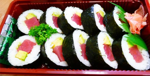 Cara Membuat Sushi Khas Makanan Tradisional Jepang dengan tambahan Isi ikan Salmon serta buah Alpukat :